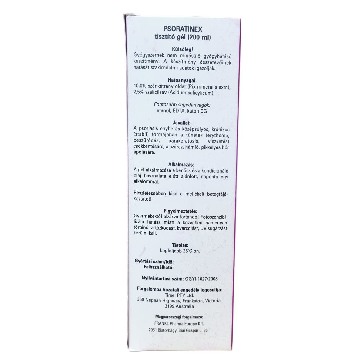 A Psoratinex tisztító gél külsőleg alkalmazandó gyógyszernek nem minősülő gyógyhatású készítmény, mely hatóanyagai a szénkátrány oldat és a szalicilsav. Ezek hatását szakirodalmi adatok igazolják. A gél a pikkelysömör enyhe és középsúlyos, krónikus (stabil) formájában a bőr tüneteinek – így az erythema, beszűrődés, parakeratosis és viszketés – csökkentésére szolgál, valamint a száraz, hámló, pikkelyes bőr ápolására. A termék egyensúlyban tartja a bőrt, előkészítve a további kezeléseket, mint a kenőcs és a kondicionáló olaj használatát. A használat során figyelembe kell venni a fotoszenzibilizáló hatást, ezért a fényvédelmi előírásokat be kell tartani. A termék biztonságos tárolása legfeljebb 25°C-on ajánlott, továbbá fontos a gyermekektől való elzárás. A részletes használati utasítás a mellékelt betegtájékoztatóban található.