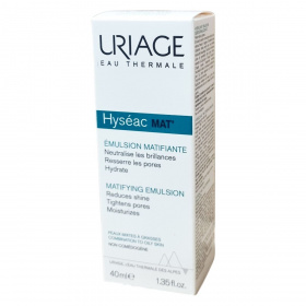 Az Uriage Hyséac MAT' emulzió egy mattító, hidratáló krém, amely specifikusan a kombinált és zsíros bőr napi ápolására lett kifejlesztve. Hatékonyan semlegesíti a felesleges faggyút és csökkenti a bőr csillogását mikrorészecskék segítségével, amelyek fényt szórnak. A zsírtermelést az édesgyökér kivonat szabályozza, míg a Pore refinyl® szabadalmaztatott összetevő segít összehúzni a kitágult pórusokat, javítva a faggyú minőségét és megelőzve a pórusok eltömődését, ezáltal csökkentve a pattanások és bőrhibák kialakulását. Az Uriage termálvíz, amely gazdag ásványi anyagokban és nyomelemekben, antioxidáns tulajdonságokkal bír, erősíti a bőr természetes védőrétegét, hidratálja és nyugtatja még a legérzékenyebb bőrt is. Könnyű, frissítő és hosszan tartó hidratáló textúrájával bársonyosan matt megjelenést biztosít és kiváló sminkalapként szolgál. A termék bőrgyógyászati teszteken alapul, aknéra hajlamos bőrön is kipróbált, paraben- és színezékmentes, hipoallergén formula. Az Uriage termálvíz a Francia Alpok természetes forrásából származik, ahol több mint 200 éve használják jótékony hatásai miatt, és az Uriage laboratóriumaival közösen fejlesztették ki ezt a bőrápolót, hogy megőrizze és védje a bőr egészségét minden nap.