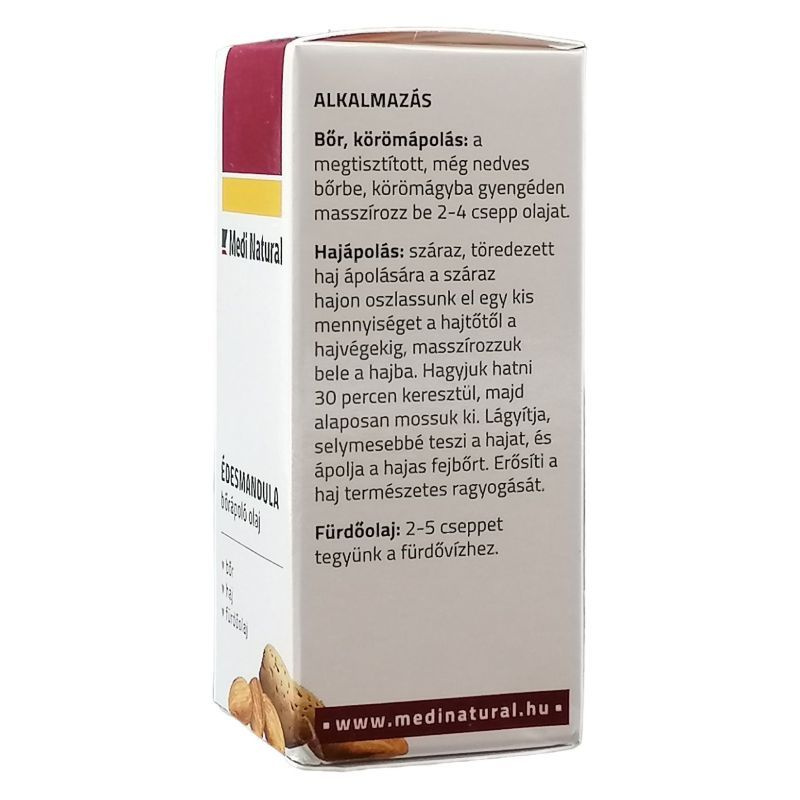 A mandulaolaj érzékeny és száraz bőr elsőrendű tápláló és védő olaja, amely ideális az irritált és kiszáradt bőr regenerálására. Nyugtató hatása azonnali felüdülést hoz a dehidratált, hámló, viszkető bőrnek - gombás bőrfertőzések esetén is enyhíti a tüneteket, gyorsítja a bőrsejtek gyógyulási folyamatait még az ekcéma esetén is. A mandulaolaj puhítja a sarok, talp vagy könyök felületén megkeményedett bőrt. A mandulaolaj használható önmagában vagy illóolajokkal keverve testápolásra is. Kiválóan vegyül az illóolajokkal ezért tökéletes választás hordozóolajként aromaterápiás felhasználásra.