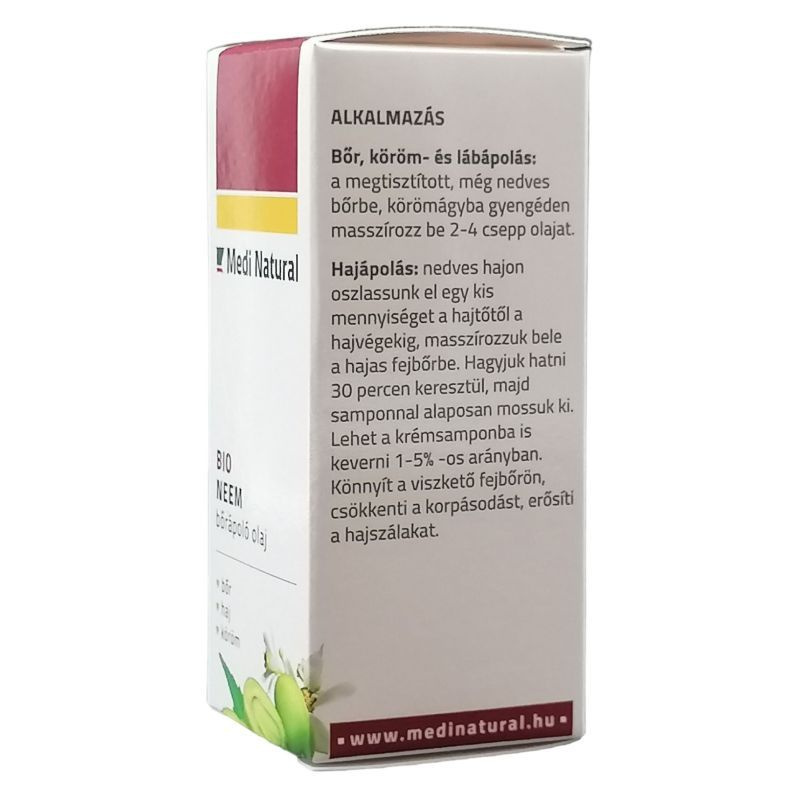 A Neem bőrápoló olaj erős gyulladáscsökkentő, valamint parazita, gomba, baktériumellenes és rovarriasztó hatóanyagai alkalmassá teszik használatát, olyan bőrbántalmak esetén is, mint: korpa, körömgomba, pattanás ekcéma, hegek, gyulladt bőr, csalánkiütés szemölcsök, herpesz, tetvesség és egyéb bakteriális és vírusos bőrbetegségek esetén.