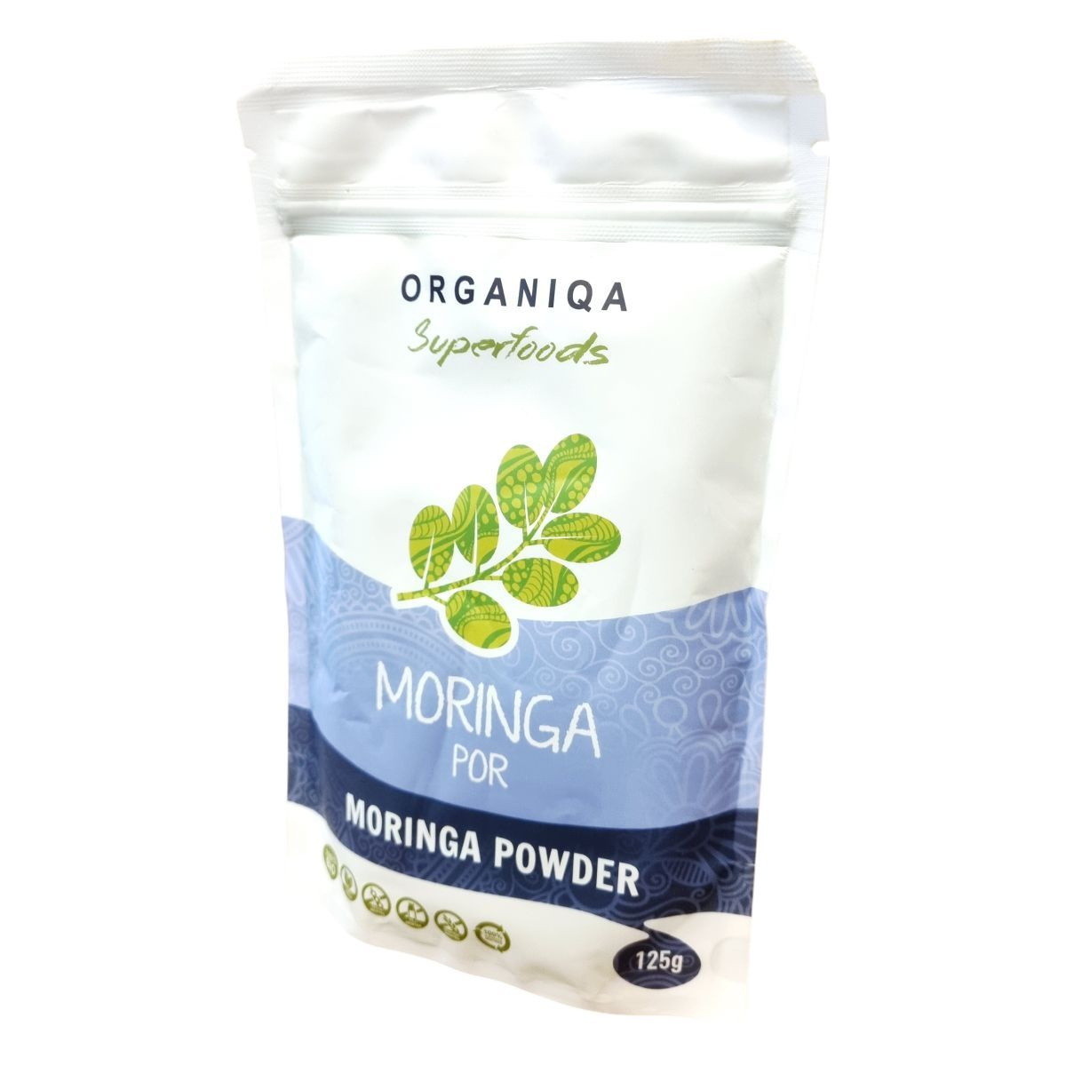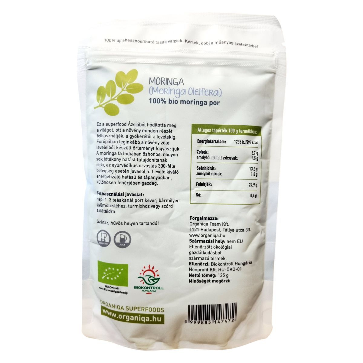 A moringa fa Indiában őshonos, és az ayurvédikus orvoslásban 300-féle betegség esetén javasolják. A moringa por Ázsiából származik, ahol a növény minden részét felhasználják. Európában leginkább a zöld leveleiből készült őrleményt fogyasztják. A termék 100% újrahasznosítható tasakban kapható, és ellenőrzött ökológiai gazdálkodásból származik, amit a Biokontroll Hungária Nonprofit Kft. ellenőriz.