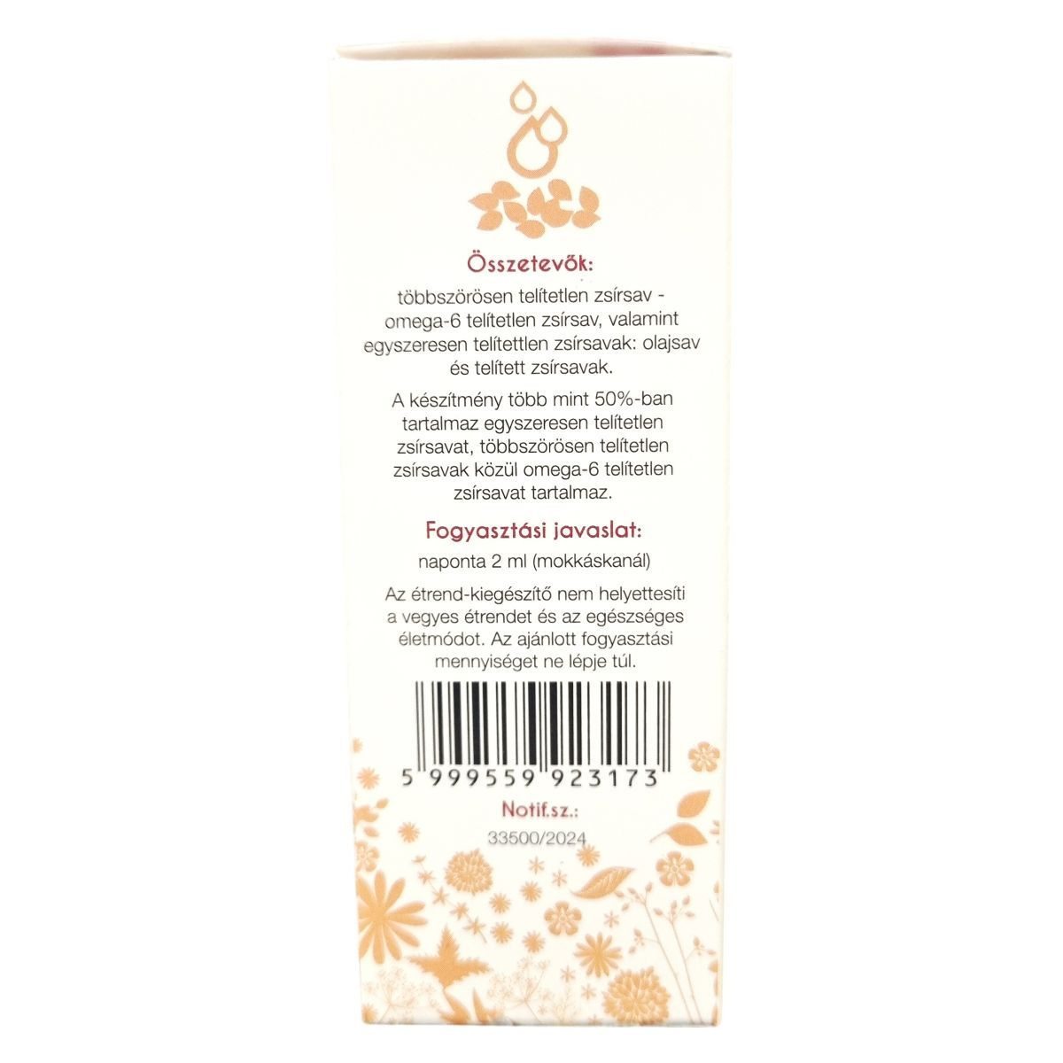 Ez a folyékony étrend-kiegészítő magas arányban tartalmaz egyszeresen és többszörösen telítetlen zsírsavakat, amelyek támogathatják a szervezet egészséges működését.