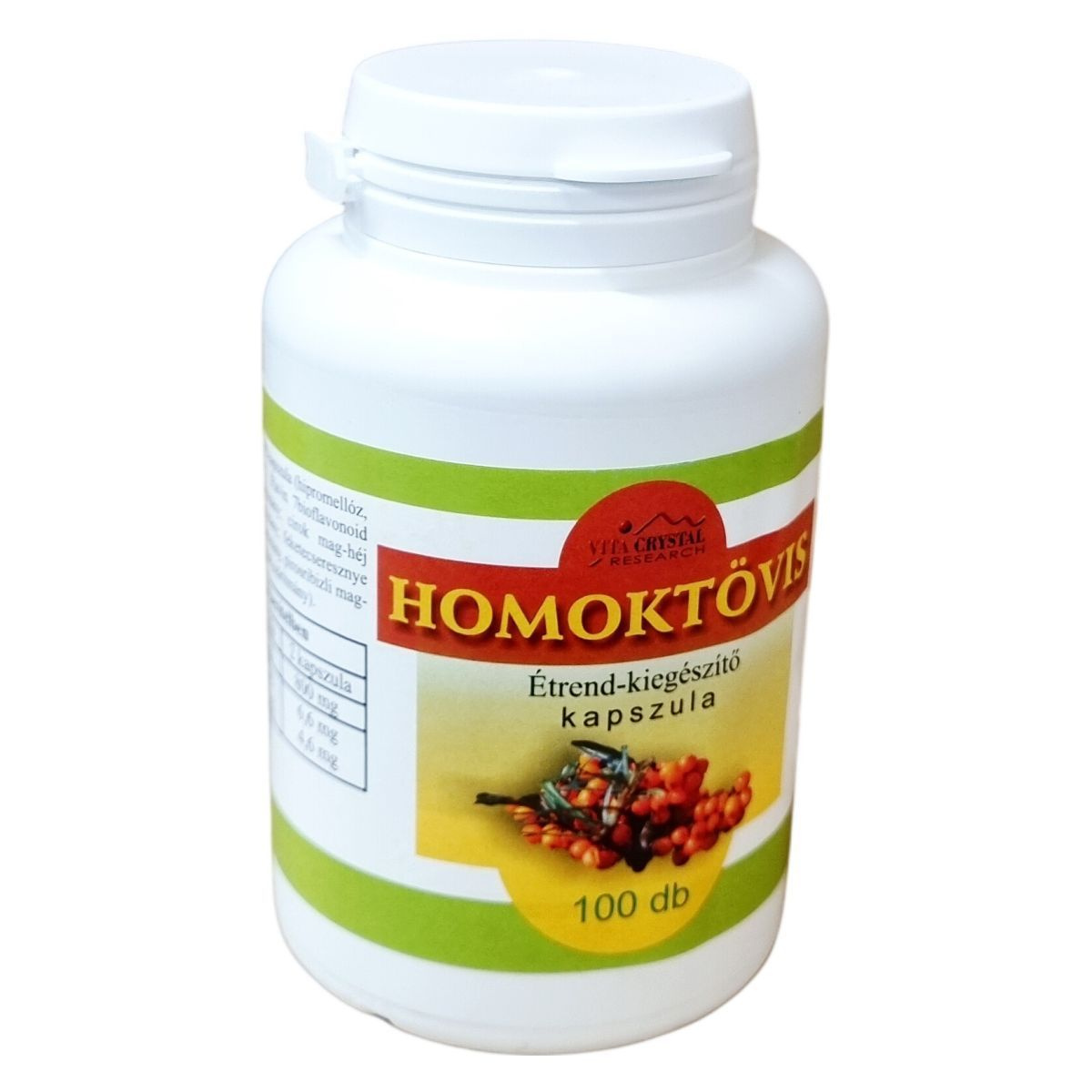 A Vita Crystal Homoktövis étend-kiegészítő kapszula egy polifenollal gazdagított termék, amely homoktövis kivonatot és Flavin 7 bioflavonoid komplexet tartalmaz. A bioflavonoid komplex többféle gyümölcshéj szárítmányából áll, amelyek hozzájárulhatnak az antioxidáns hatás támogatásához. A termék kapszulás formában készül, HPMC bevonattal, és ajánlott napi 1-2 kapszula bevitele vízzel. A termék teljes nettó tömege 62 g, egy doboz 100 kapszulát tartalmaz, egyenként 620 mg-os kiszerelésben. Az étrend-kiegészítő használata mellett javasolt a vegyes és kiegyensúlyozott étrend, valamint az egészséges életmód fenntartása.