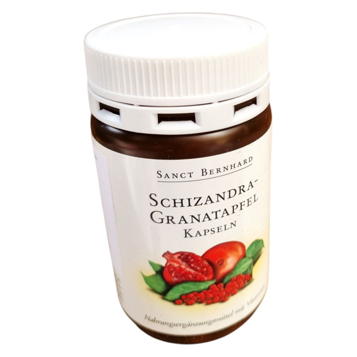 A SANCT BERNHARD Schizandra-Gránátalma kapszula egy étrend-kiegészítő, amely 90 kapszulát tartalmaz. A termék fő összetevői a schizandra és gránátalma kivonatok, amelyek antioxidáns tulajdonságokkal bírhatnak. A B6-, B12-vitamin és folsav hozzájárulhatnak az immunrendszer normál működéséhez. A kapszulák zselatinból készültek, és tartalmaznak kukoricakeményítőt, valamint csomósodást gátló anyagokat is. A termék Németországban készült, és a magyarországi forgalmazója az ODP Vital Kft. A kapszulákat száraz, sötét helyen, 25 °C alatt kell tárolni, és a gyermekektől elzárva tartandók. Az ajánlott napi mennyiséget nem szabad túllépni.