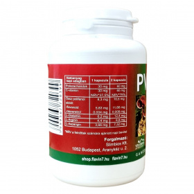 Flavin7 bioflavonoid komplex (vörösszőlő mag-héj szárítmány, cirok mag-héj szárítmány, feketeszeder mag-héj szárítmány, feketecseresznye héj szárítmány, feketeribizli mag-héj szárítmány, pirosribizli mag-héj szárítmány, szilva héj szárítmány, almahéj szárítmány), kendermag őrlemény, HPMC kapszula (hipromellóz, cink-oxid, sűrítőanyag: karragén, emulgeálószer: glicerin), Ganoderma Lucidum őrlemény, C-vitamin (L-aszkorbinsav).