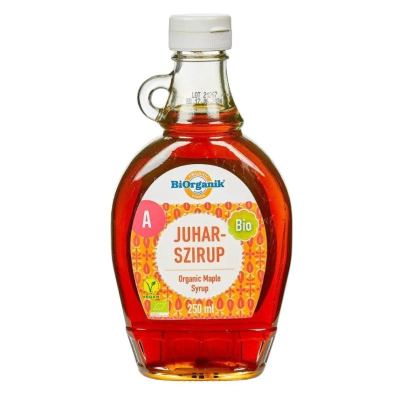 Összetevők: juharszirup Ellenőrzött Ökológiai Gazdálkodásból HU-ÖKO-01. Ellenőrizte: Biokontroll Hungária Nonprofit Kft. Tápanyagtartalom (100g-ban): Energiaérték: 1129KJ / 266 kcal, Fehérje: <0,2%, Szénhidrát: 66%, Zsír: 0%. Jó tudni: a növényi szirupok az emberi szervezet számára a legkedvezőbb édesítőszerek.