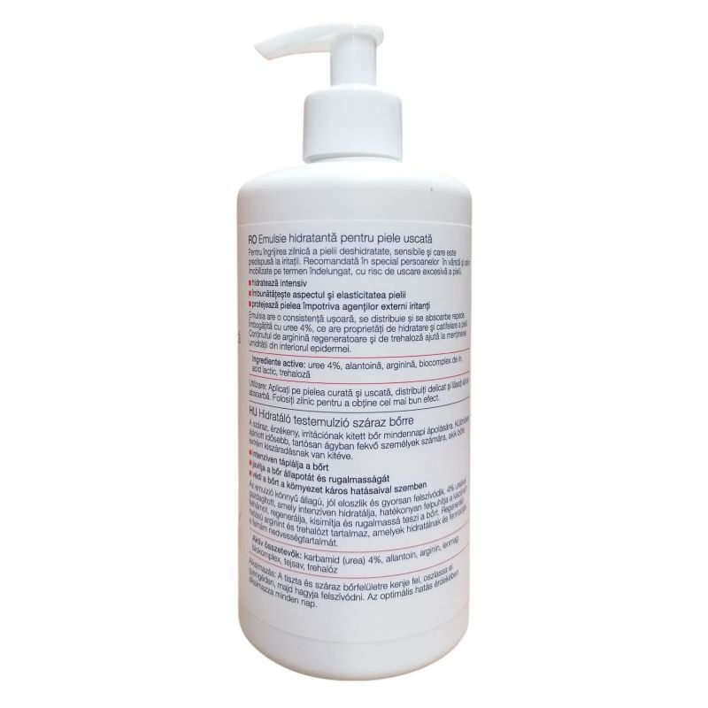 Praktikus pumpás adagolóval, mindennapos használatra. Aktív hatóanyagai: 4% urea, allantoin, arginin, lenmag biokomplex, trehalóz, tejsav.
