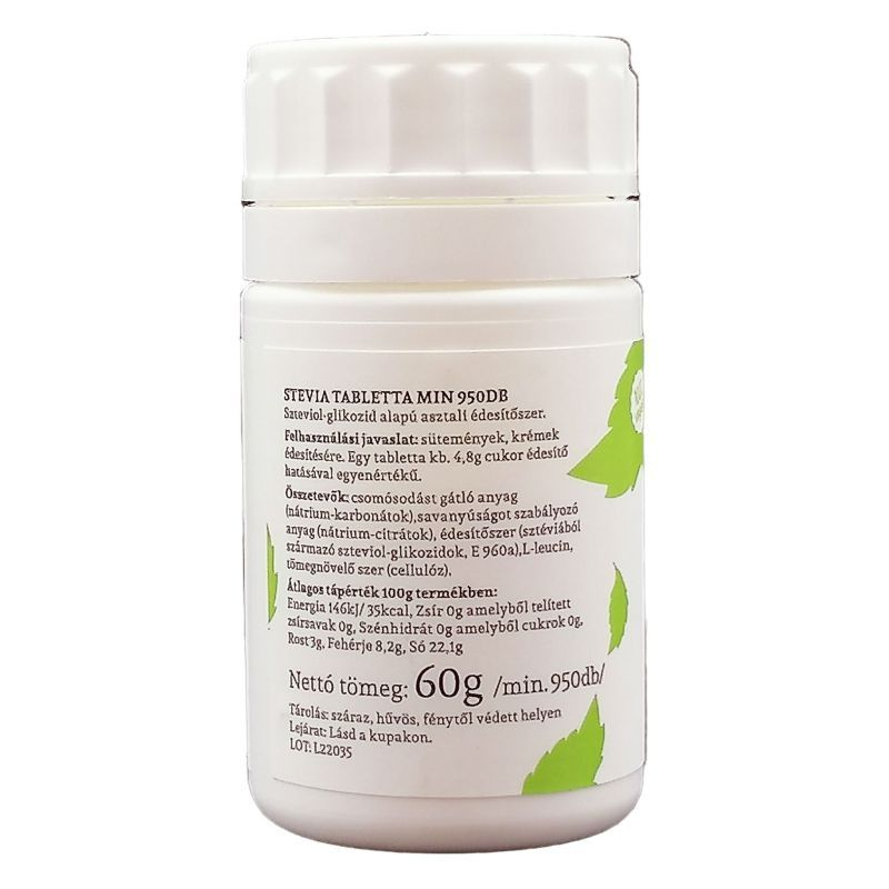 Átlagos tápérték 100 gramm Stevia tablettában: Energia: 146 kJ/35 kcal, zsír: 0 g -amelyből telített zsírsavak: 0 g,szénhidrát: 0 g -amelyből cukrok: 0 g, fehérje: 8,2 g, só: 22,1 g.