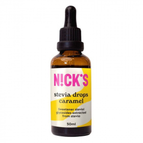 Nick’s karamellás stevia cseppek 50 ml. Hozzáadott cukrot nem tartalmaz, 0 kalóriás édesítőszer, gluténmentes. Nagy mennyiségben történő fogyasztása hashajtó hatású lehet. Használati utasítás: 5 cseppet adj hozzá a kávédhoz, teádhoz stb.