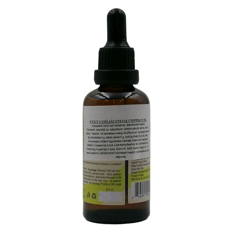 Nick’s vaníliás stevia cseppek 50 ml. Hozzáadott cukrot nem tartalmaz, 0 kalóriás édesítőszer, gluténmentes. Nagy mennyiségben történő fogyasztása hashajtó hatású lehet. Használati utasítás: 5 cseppet adj hozzá a kávédhoz/teádhoz stb.