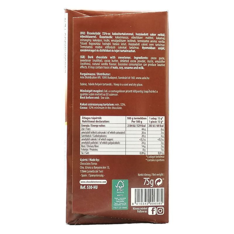 A 72%-os étcsokoládé, amely hozzáadott cukor nélkül készült, egy különleges élményt kínál a csokoládé szerelmeseinek. Ez a gazdag és intenzív ízű édesség tökéletes választás mindazok számára, akik szeretnék élvezni a csokoládé ízét anélkül, hogy a cukorral járó kalóriákat és egészségügyi kockázatokat vállalnák. A csokoládé készítése során a legjobb minőségű kakaóbabot használták fel, amely biztosítja a mély, karakteres ízvilágot. A gluténmentes összetevőknek köszönhetően ez a termék ideális választás a gluténérzékenyek számára is, lehetővé téve számukra, hogy élvezhessék a csokoládé adta örömöket. A csokoládé nemcsak ízletes, hanem tápláló is, hiszen a kakaó gazdag antioxidánsokban, amelyek hozzájárulhatnak a szív- és érrendszeri egészség megőrzéséhez. A csomagolás praktikus, így könnyen magunkkal vihetjük, legyen szó egy gyors nassolásról vagy egy különleges alkalomról.