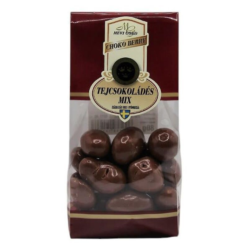 A vegyes válogatás tejcsokoládéval bevont diófélékből és aszalt gyümölcsökből áll.