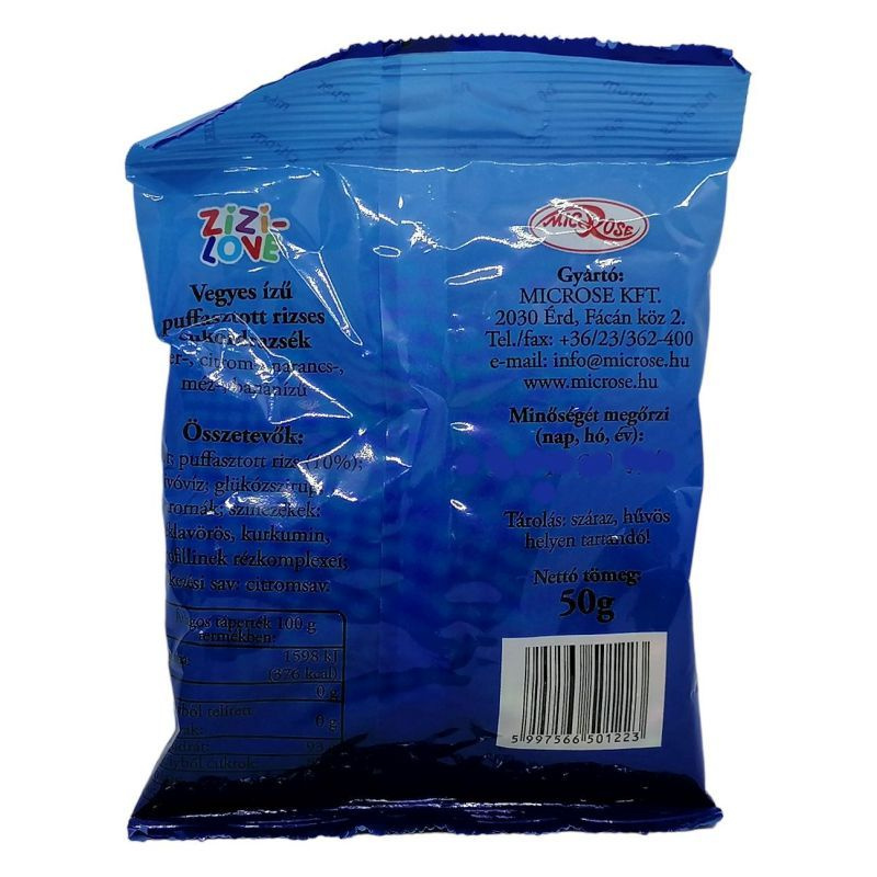 Összetevők: puffasztott rizs, cukor, ízesítők (eper, citrom, narancs, méz, szilva, kivi, szeder), színezékek.