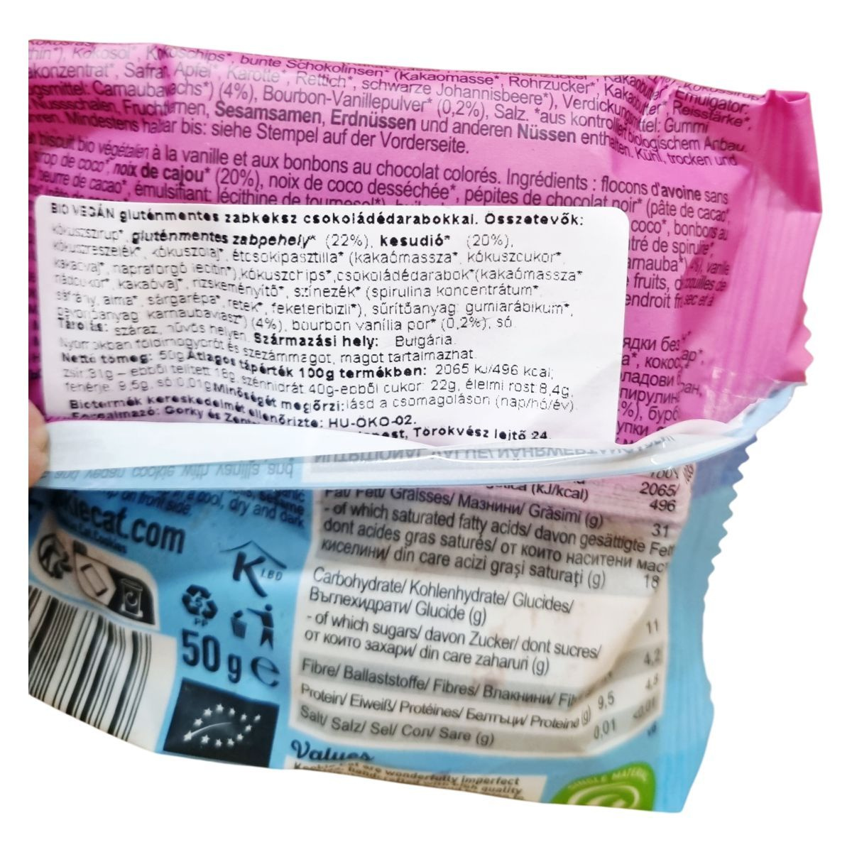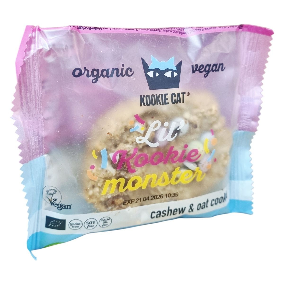 A Lil’ Kookie Monster egy organikus, vegán keksz gluténmentes zabpehelyből, kesudióval és színes csokoládédarabokkal. Természetes növényi színezékeket és bio alapanyagokat tartalmaz.