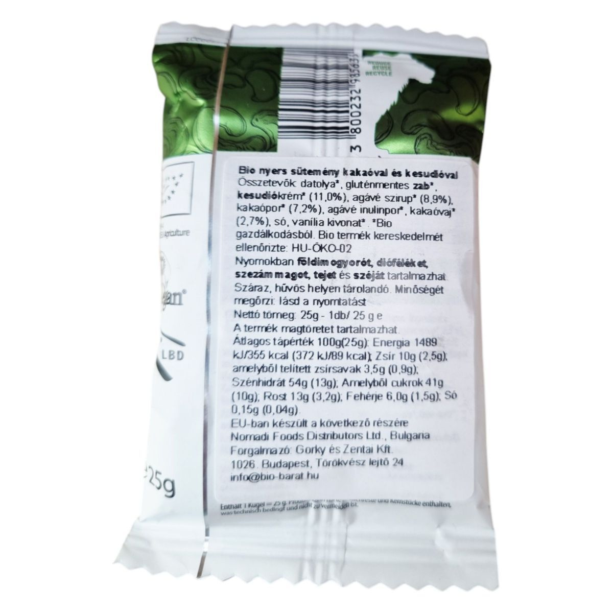 Datolya*, gluténmentes zab*, kesudiókrém* (11,0%), agávé szirup* (8,9%), kakaópor* (7,2%), agávé inulinpor*, kakaóvaj* (2,7%), só, vanília kivonat* *Bio gazdálkodásból.