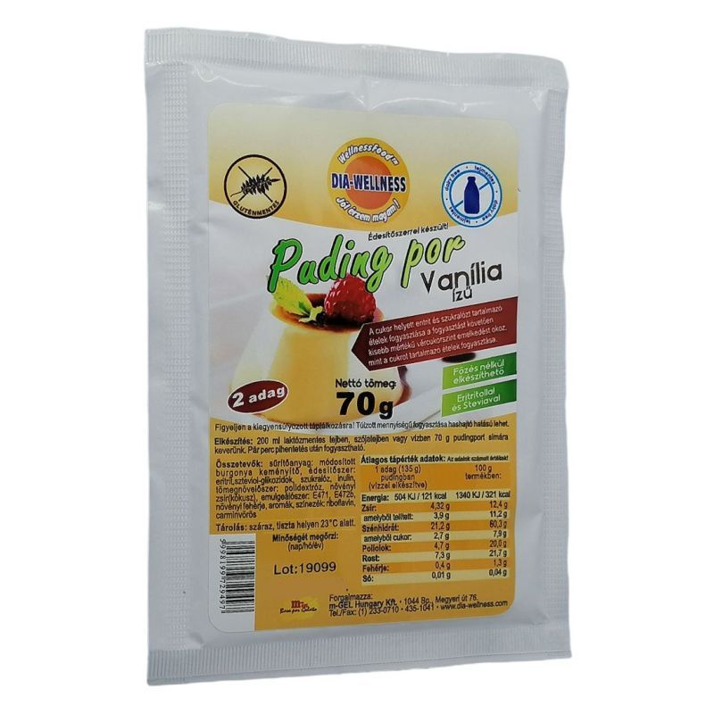 Felhasználási javaslat: 200 ml laktózmentes tejben, szójatejben vagy vízben 70 g pudingot simára keverünk. Pár perc pihentetés után fogyasztható.