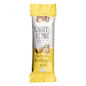 Gluténmentes, tejmentes, cukormentes, paleo, vegán, kókuszolajjal készült karamell ízű földimogyorós szelet.
