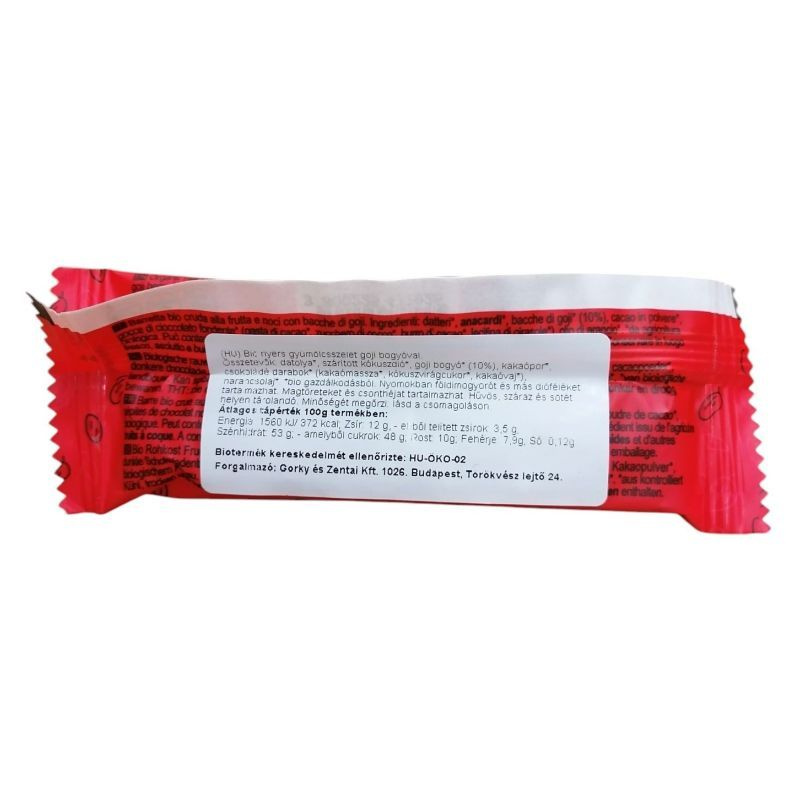 A nyers gyümölcsszelet goji bogyót tartalmaz, bio és vegán alapanyagokkal, hozzáadott cukor nélkül.