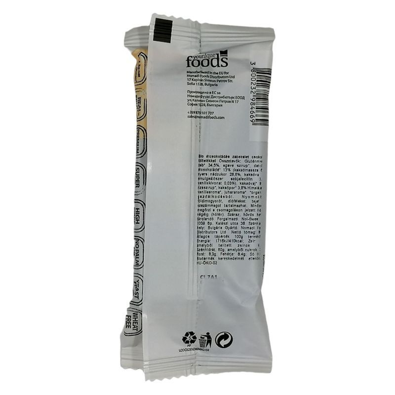 Összetevők: Gluténmentes zab* 34,5%, agavészirup*, datolya*, étcsokoládé* 13% (kakaómassza 64%, nyers nádcukor 28,6%, kakaóvaj 7%, emulgeálószer: szójalecitin 0,4%, vaníliakivonat 0,03%), kakaóvaj* 8,7%, rizsszirup*, kakaópor* 3,8% Himalája só, vaníliaaroma*, juhararoma*. *organikus gazdálkodásból.