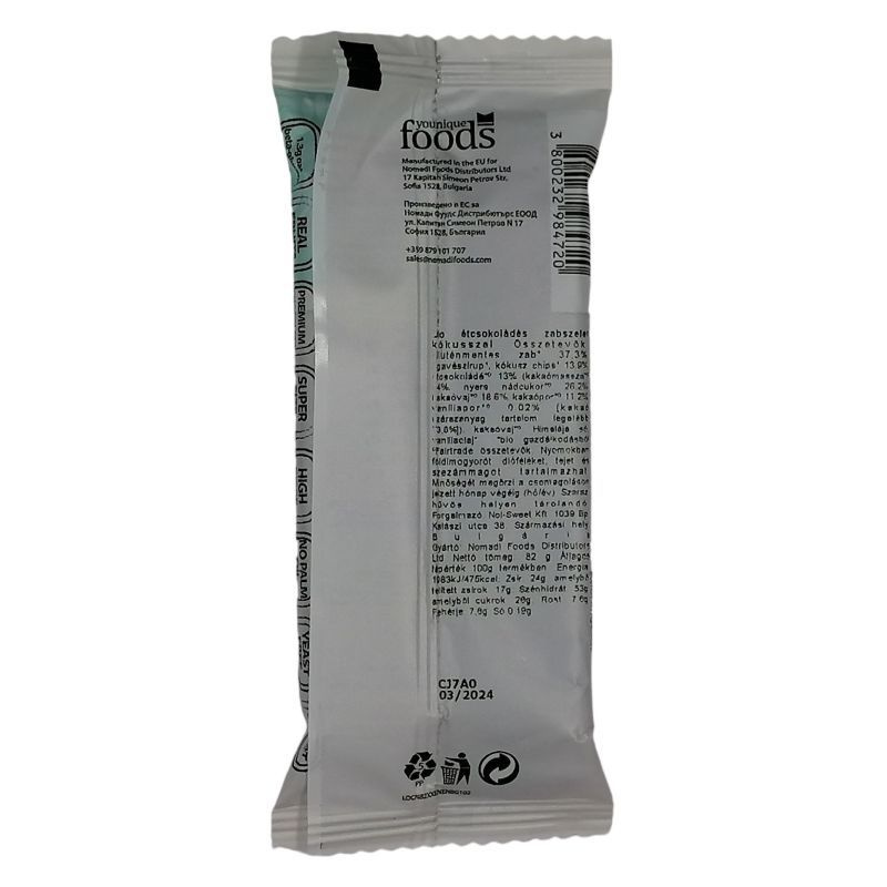 Összetevők: Gluténmentes zab* 34,5%, agavészirup*, datolya*, étcsokoládé* 13% (kakaómassza 64%, nyers nádcukor 28,6%, kakaóvaj 7%, emulgeálószer: szójalecitin 0,4%, vaníliakivonat 0,03%), kókuszpehely* 12,5%, kakaóvaj*, Himalája só, vaníliaaroma*. *organikus gazdálkodásból.