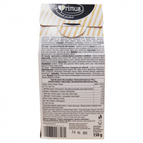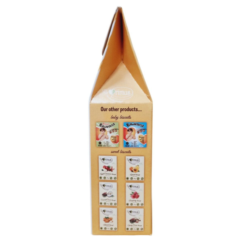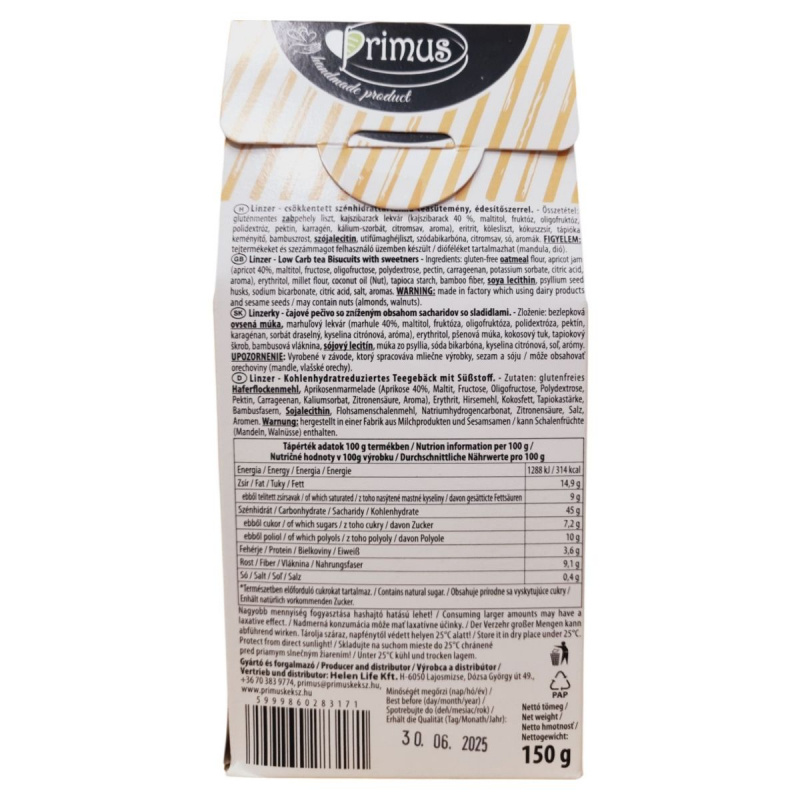 A Primus Linzer egy kézzel készített, csökkentett szénhidráttartalmú teasütemény, amely édesítőszerrel készül. Gluténmentes zabpehely liszt és kajszibarack lekvár felhasználásával készült, így azok számára is ideális lehet, akik gluténmentes étrendet követnek. A termék természetben előforduló cukrokat tartalmaz, és nagyobb mennyiség fogyasztása hashajtó hatású lehet. Tárolása száraz, napfénytől védett helyen ajánlott, 25°C alatt. A termék tejtermékeket és szezámmagot felhasználó üzemben készült, és dióféléket is tartalmazhat.