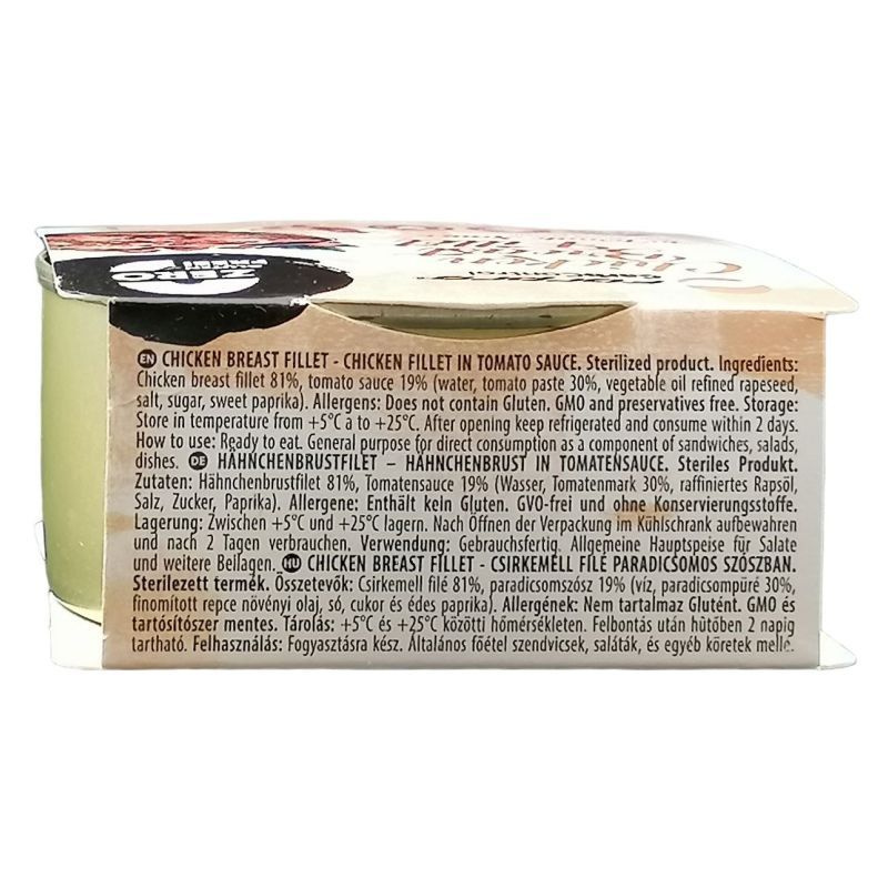 Összetétel: 81% csirkemell, 19% paradicsomszósz (víz, paradicsompüré 30%, finomított repce növényi olaj, só, cukor és édes paprika).