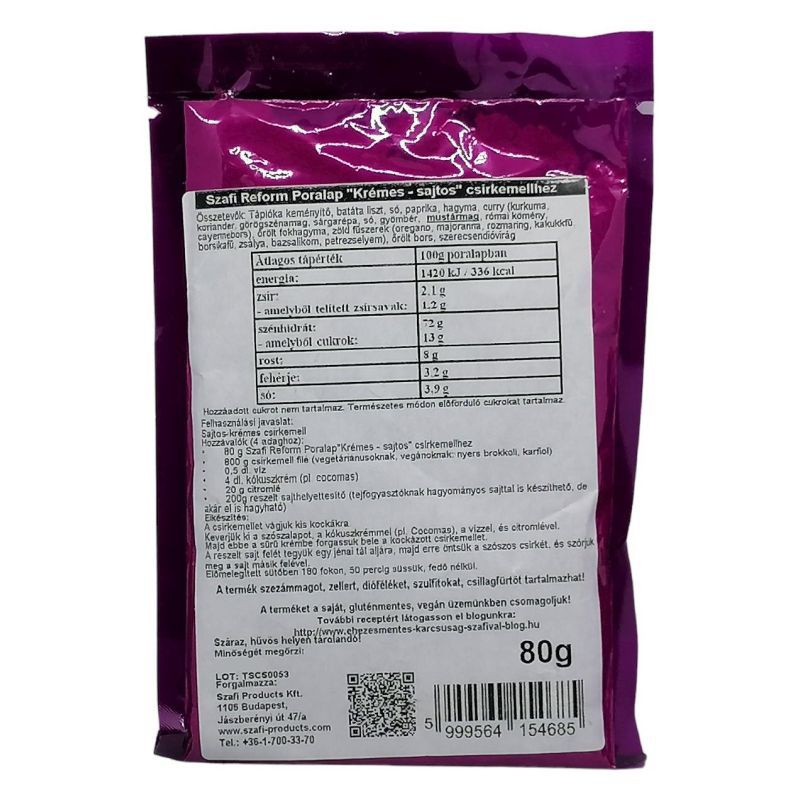 Hozzávalók (4 adaghoz): 80 g Szafi Reform Poralap"Tejszínes - sajtos" csirkemellhez, 800 g csirkemell filé (vegetáriánusoknak, vegánoknak: nyers brokkoli, karfiol), 0,5 dl. víz, 4 dl. kókusztejszín (pl. cocomas), 20 g citromlé, 200 g reszelt sajthelyettesítő (tejfogyasztóknak hagyományos sajttal is készíthető, de akár el is hagyható).