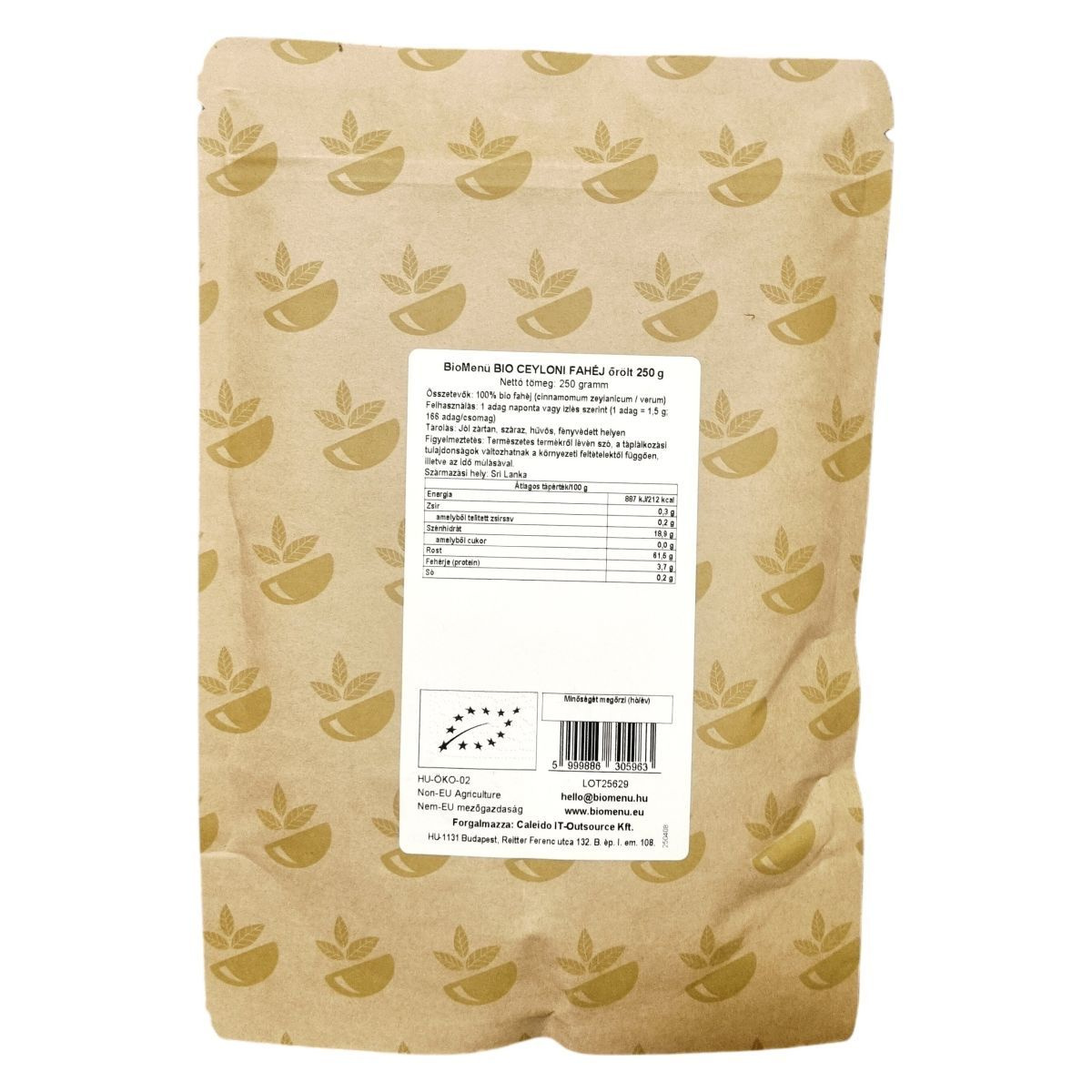 A BioMenü Ceyloni fahéj Sri Lankáról származik, ahol kiváló minőségű, bio termesztésből származó fahéjat állítanak elő. A termék 250 grammos kiszerelésben érhető el, mely 166 adagot tartalmaz. A csomagolás veganbarát, és garantáltan tiszta, 100%-ban természetes, bio alapanyagból készült. A termék nem EU mezőgazdaságból származik, és a HU-ÖKO-02 tanúsítvány igazolja minőségét. A fahéj őrölt formában kerül forgalomba, így könnyen adagolható bármilyen ételhez vagy italhoz. Mint természetes fűszer, a fahéj jellegzetes aromáján kívül a rosttartalma is kiemelkedő. A tárolásnál fontos a száraz, hűvös és fénytől védett hely választása a minőség megőrzése érdekében.