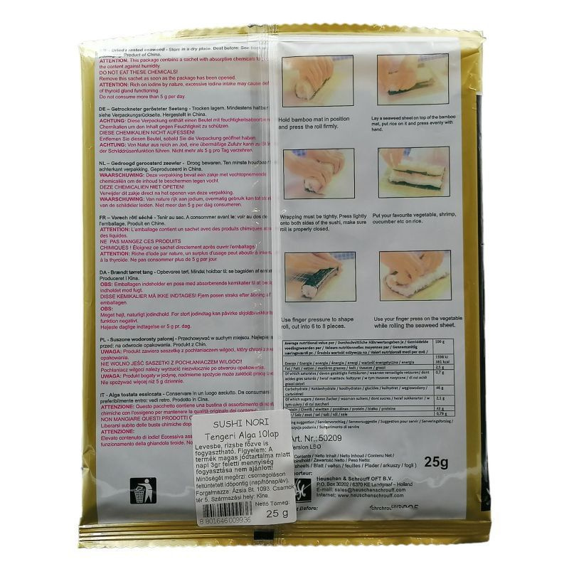 FIGYELEM! Nagyon magas jódtartalmú termék! Max. 2,5 g szárított nori fogyasztható naponta (1 lap). A csomagban egy nedvesség elszívó vegyszert tartalmazó kis tasak található, ezt felnyitás után azonnal dobja ki!