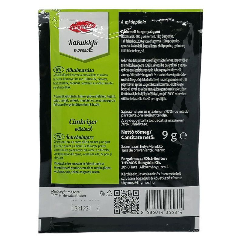 A szárított kakukkfű egy különleges fűszer, amely a mediterrán konyha egyik alapvető eleme. A Thymos szárított kakukkfű 9g-os kiszerelése ideális választás mindazok számára, akik szeretnék felfedezni a kakukkfű gazdag ízvilágát és aromáját. A kakukkfű nemcsak ízesíti az ételeket, hanem számos jótékony hatással is bír. A fűszer szárított formában is megőrzi friss, aromás ízét, így bármikor könnyedén felhasználható. A kakukkfű levelei apró, zöld színűek, és erőteljes, fűszeres illatot árasztanak, amely az ételekhez adja a karaktert. A szárított kakukkfű sokoldalúan felhasználható, hiszen tökéletesen illik húsételekhez, zöldségekhez, levesekhez és szószokhoz egyaránt. A fűszer nemcsak ízletes, hanem tápláló is, hiszen gazdag antioxidánsokban és vitaminokban, amelyek hozzájárulhatnak az egészség megőrzéséhez.