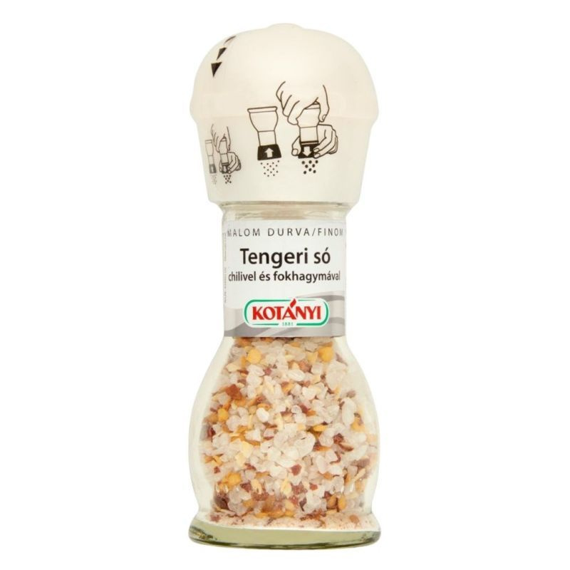 A tengeri só fokhagymával és chilivel kombinálva pikáns ízesítést nyújt, praktikus darálós kiszerelésben.
