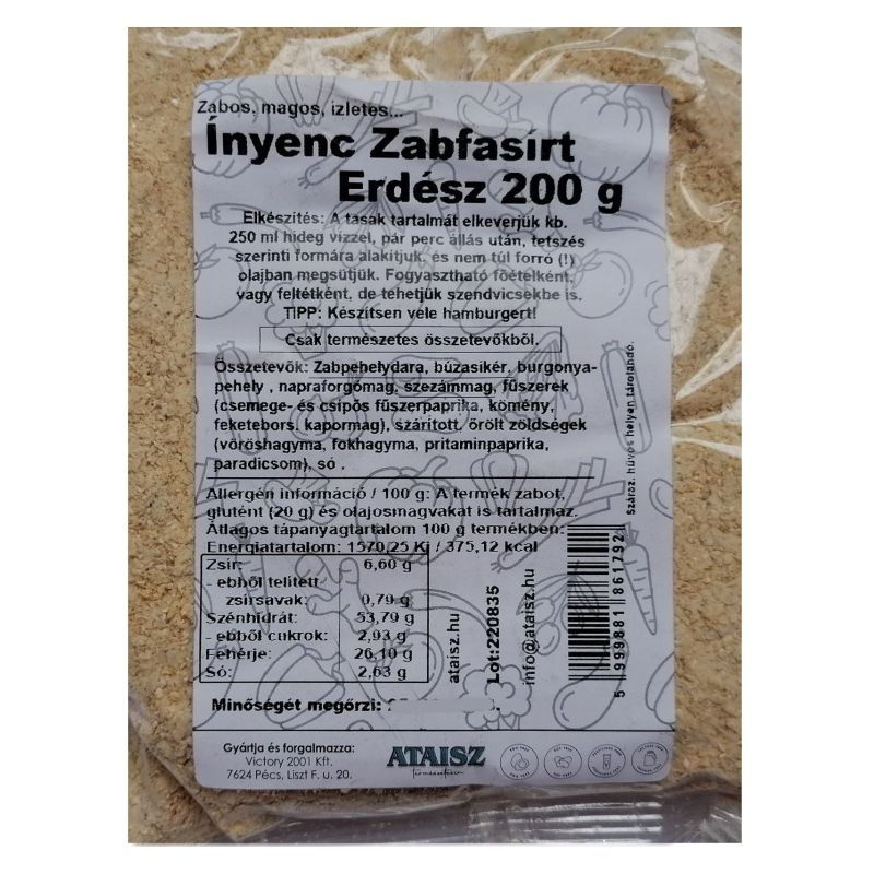 A zab, kiemelkedően magas tápértékű gabona. Lassan felszívódó szénhidrátokat tartalmaz, ezért hosszan látja el szervezetünket energiával. Elkészítés: a tasak tartalmát elkeverjük kb. 250 ml hideg vízzel, pár perc állás után, tetszés szerinti formára alakítjuk, és nem túl forró (!) olajban megsütjük. Fogyasztható főételként, vagy feltétként, de tehetjük szendvicsekbe is. TIPP: Készítsen vele hamburgert! Nem tartalmaz: aromát, fűszerkivonatot, tartósítót.
