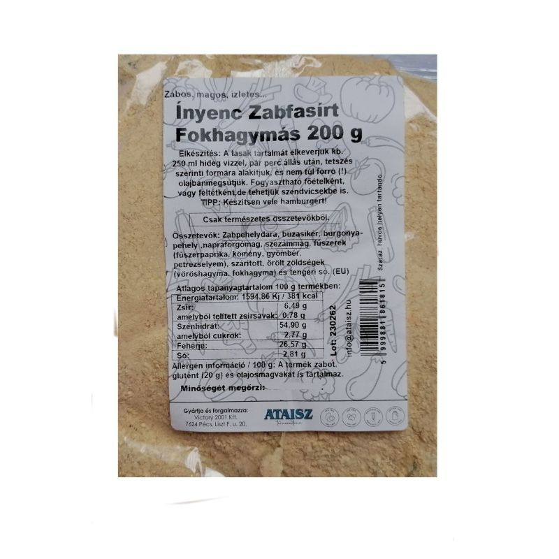 Zabos, magos, ízletes... A zab, kiemelkedően magas tápértékű gabona. Lassan felszívódó szénhidrátokat tartalmaz, ezért hosszan látja el szervezetünket energiával. Elkészítés: a tasak tartalmát elkeverjük kb. 250 ml hideg vízzel, pár perc állás után, tetszés szerinti formára alakítjuk, és nem túl forró (!) olajban megsütjük. Fogyasztható főételként, vagy feltétként, de tehetjük szendvicsekbe is. TIPP: Készítsen vele hamburgert! Nem tartalmaz: aromát, fűszerkivonatot, tartósítót.