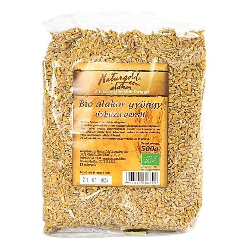Bio tisztított alakor ősbúza. Kóstolj bele az ősi ételek ízvilágába! Az alakor gyöngyként ismert hántolt ősbúza szemek selymesen lágy ízével valódi gasztronómiai csodát varázsolhatsz, ha levesbetétként, köretként, rakott és töltött ételekbe, vagy salátaként készíted el. Kétszeres mennyiségű vízben,10-15 perc főzés alatt elkészül.
