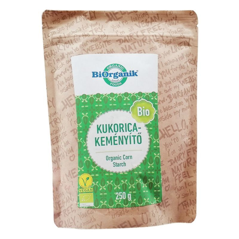 Bio kukoricakeményítő, ellenőrzött ökológiai gazdálkodásból. Zselatinmentes keményítő. Felhasználási javaslat: ételek, pudingok, desszertek, levesek, szószok sűrítésére, tészták készítésére, valamint textíliák keményítéséhez. Átlátszóan sűrít. Allergének: gabonát, szójababot, dióféléket, zellert, mustárt, szezámmagot csomagoló üzemben készült.