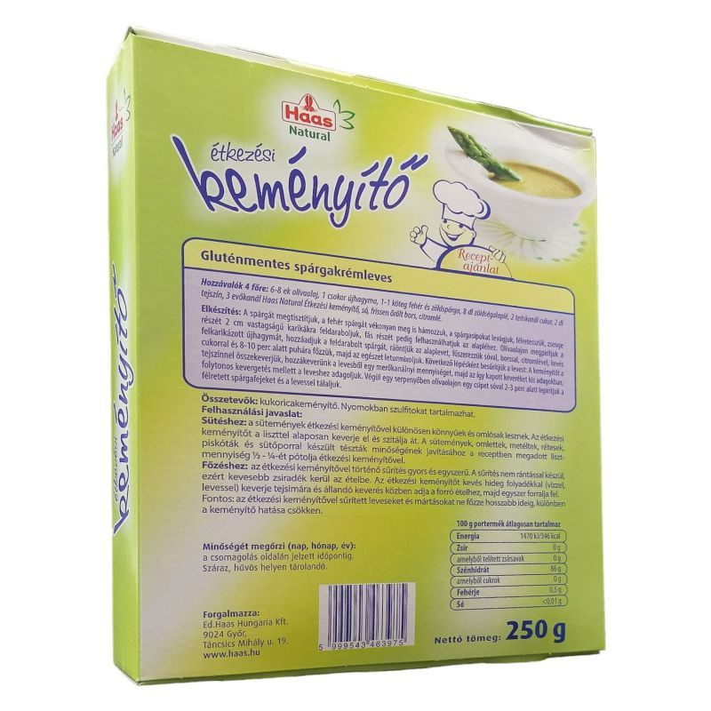 Haas étkezési keményitő keményítővel sűrített leveseket és mártásokat nem szabad hosszabb ideig főzni, különben a keményítő hatása csökken. Ha a habaráshoz nem lisztet, hanem étkezési keményítőt használunk, akkor az ételnek sokkal lágyabb, kellemesebb íze lesz, sőt az étel energiatartalma is csökkenthető. Gluténmentes.