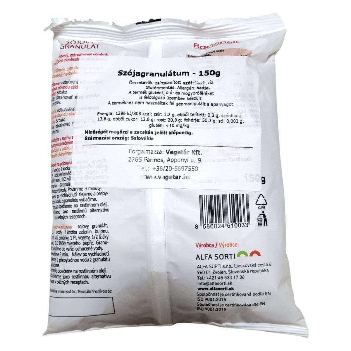 A szójagranulátum növényi fehérjében gazdag, gluténmentes és GMO-mentes alapanyag, amely rosttartalmával és sokoldalú felhasználásával hozzájárulhat a változatos étrend kialakításához.