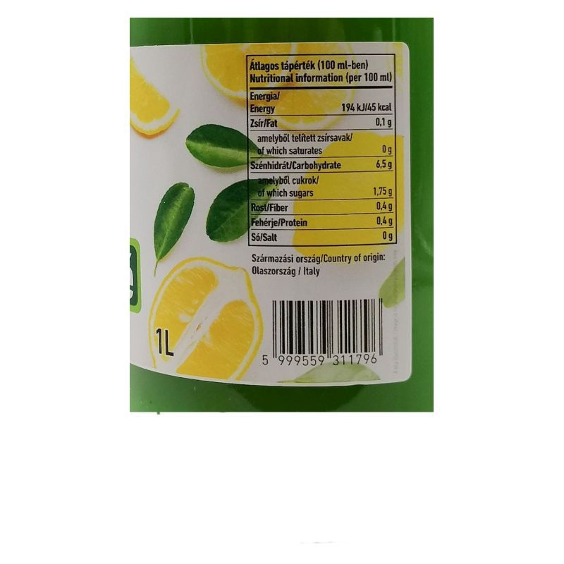 Összetevők: citromlé*. *= Ellenőrzött Ökológiai Gazdálkodásból HU-ÖKO-01. Ellenőrizte: Biokontroll Hungária Nonprofit Kft. Felhasználása: italokhoz, süteményekhez, jégkrémekhez, szörpökhöz. Jó tudni: felbontás után hűtőben tartandó! Tápanyagtartalom (100 g-ban): Energiaérték: 120 kJ/28 Kcal, zsír: 0,1 g -amelyből telített zsírsavak: 0 g, szénhidrát: 6,5 g -amelyből cukrok: 1,75 g, rost: 0,4 g, fehérje: 0,4 g, só: 0 g. Száraz, hűvös helyen tartandó! Származási ország: Olaszország. Bio és gluténmentes.