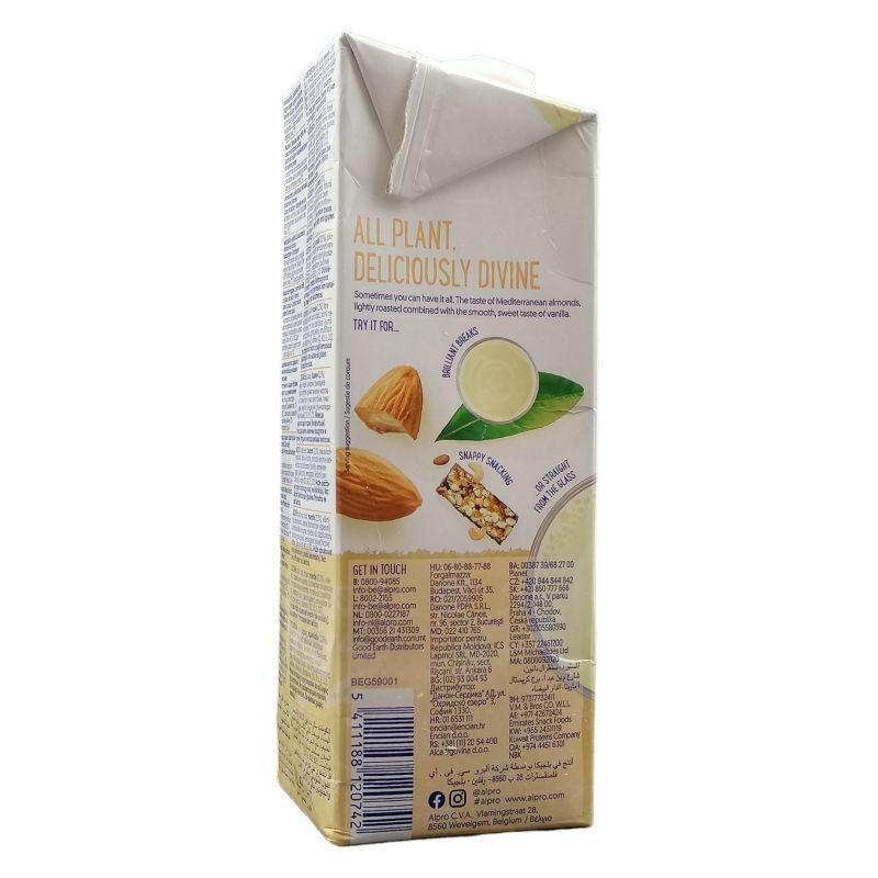 Összetevők: ivóvíz, cukor, mandula (2,3%), cikóriagyökérrost, trikálcium-foszfát, természetes vanília aroma, tengeri só, stabilizátorok (szentjánoskenyérliszt, gellángumi), emulgeálószer (lecitinek (napraforgó)), vitaminok (B2, B12, E, D2).