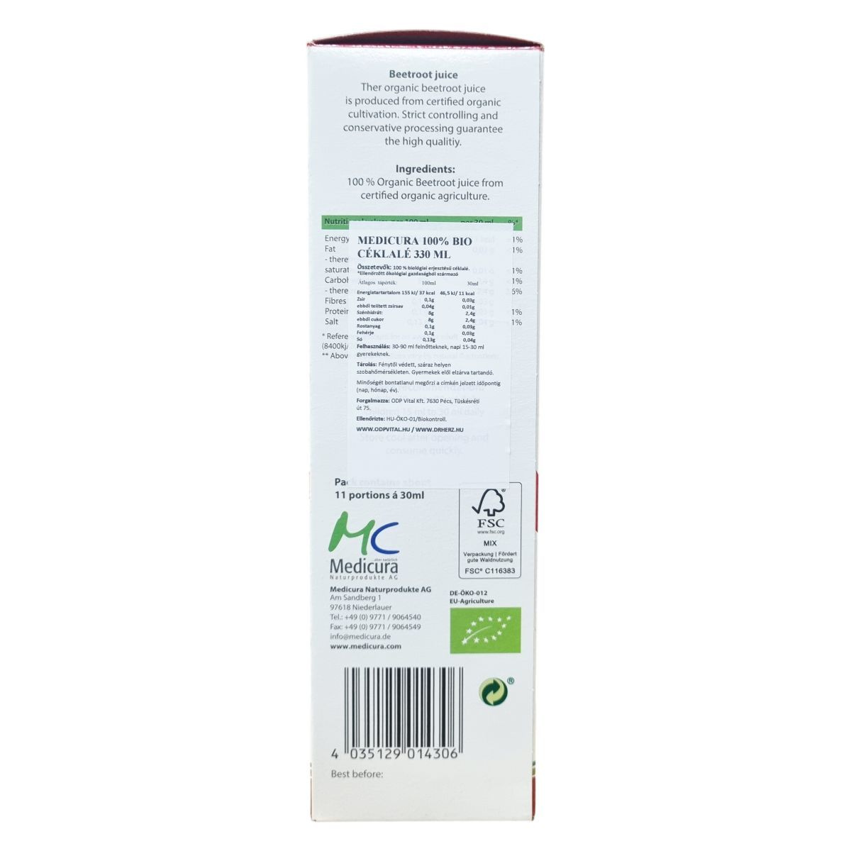 A Medicura bio céklalé természetes és tiszta levet biztosít, melyet ellenőrzött, szigorúan szabályozott organikus termesztésből származó céklából sajtolnak ki. A termék kíméletes feldolgozással készül, hogy megőrizze tápanyagtartalmát és frissességét. A 330 ml-es kiszerelés körülbelül 11 adag 30 ml-es egységből áll, így könnyen adagolható. A csomagolás FSC minősítéssel rendelkezik, támogatva a fenntartható erdőgazdálkodást. Ez a lé tökéletes választás azok számára, akik természetes módon szeretnék egészségüket támogatni, miközben bio és vegán terméket keresnek.