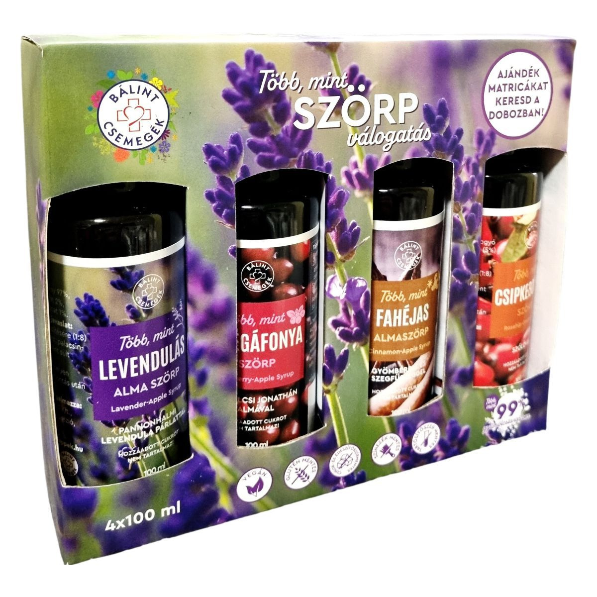 4 különleges szörp egy csomagban: levendulás alma, tőzegáfonya, fahéjas alma és csipkebogyó szőlővel. Természetes összetevőkkel, hozzáadott cukor nélkül, több mint 99% gyümölcstartalommal.