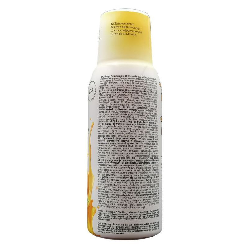 Fruttamax gyümölcsszörp narancs 50% gyümölcstartalommal,1: 23 hígitási arány, steviaval és izocukorral édesítve.