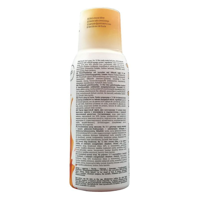 Őszibarack gyümölcsszörp. 12 liter kész gyümölcsitalhoz, izocukorral és édesítőszerrel, csökkentett energiatartalommal.