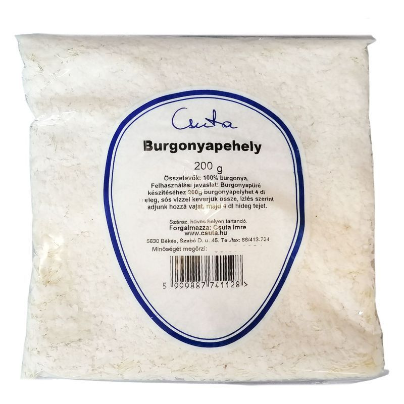 A termék 100% burgonyából készült pehely, adalékanyag nélkül, püré vagy tészták sűrítésére alkalmas.