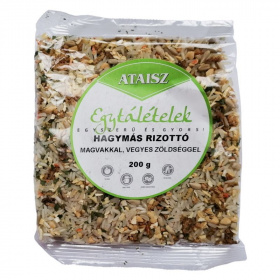 Hagymás rizottó magvakkal és zöldségekkel, amely tápláló és ízletes étel készítéséhez alkalmas.