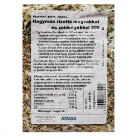 Összetevők: "A" rizs (EU), szárított sárgarépa, paszternák (EU), pirított, szárított hagyma (Kína), napraforgómag (EU), pirított mogyoró (török), petrezselyem (EU).