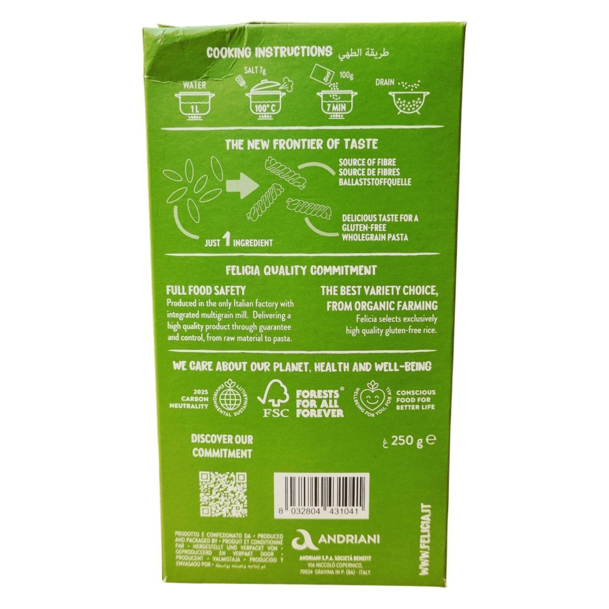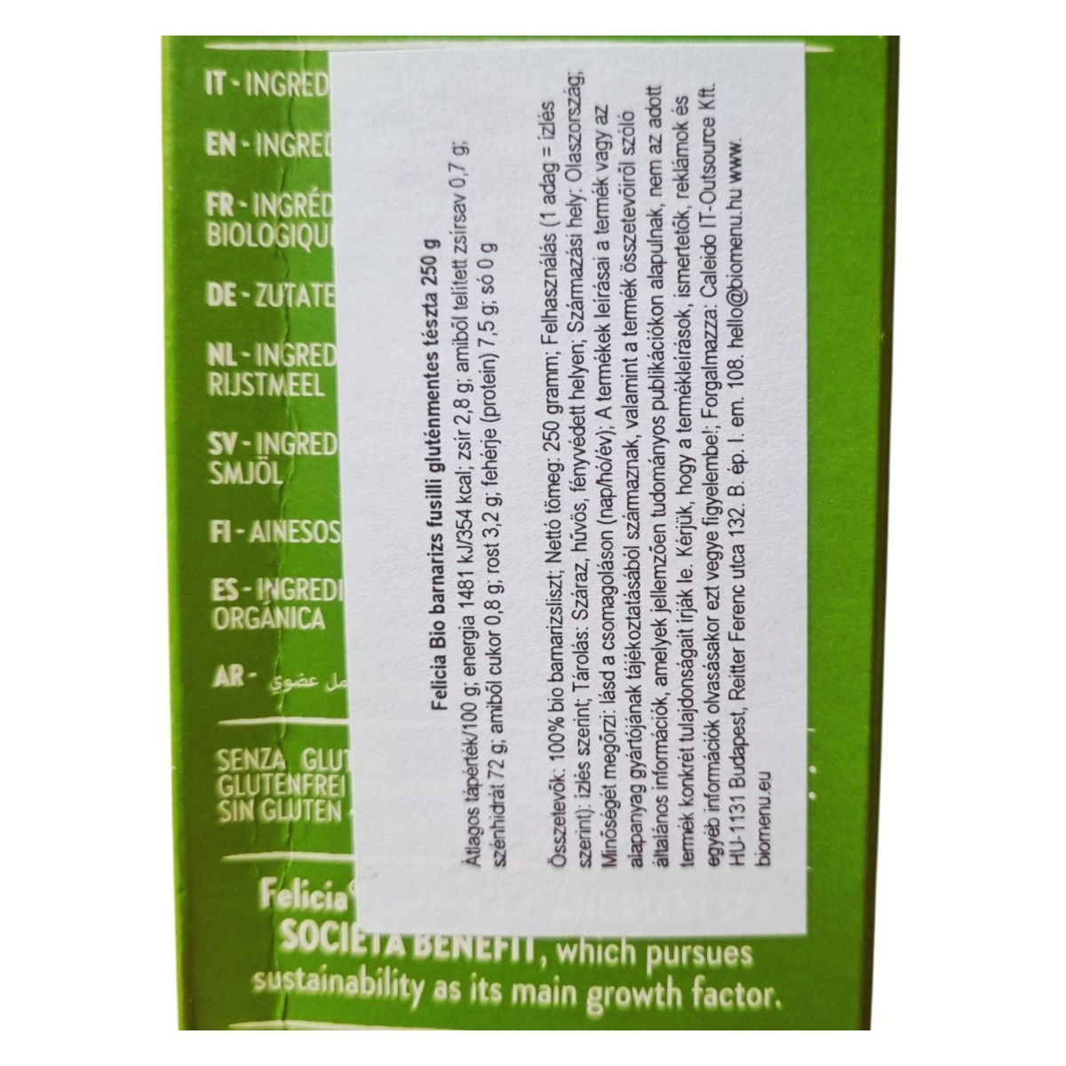A Felicia Bio barnarizs fusilli egy kiváló minőségű, organikus és gluténmentes tészta, amelyet Olaszországban gyártanak. A termék 100% bio barnarizslisztből készül, és kiváló rostforrás. A tészta mindössze 7 perc alatt elkészíthető, így gyors és egészséges választás lehet a mindennapi étkezésekhez. A Felicia márka elkötelezett a környezeti fenntarthatóság és a magas minőség mellett, amit az olaszországi integrált multigrain malomban történő gyártás is biztosít. A termék karbonsemlegességre törekszik 2025-re, és a gyártó figyelmet fordít a környezetvédelemre és a fogyasztók egészségére.