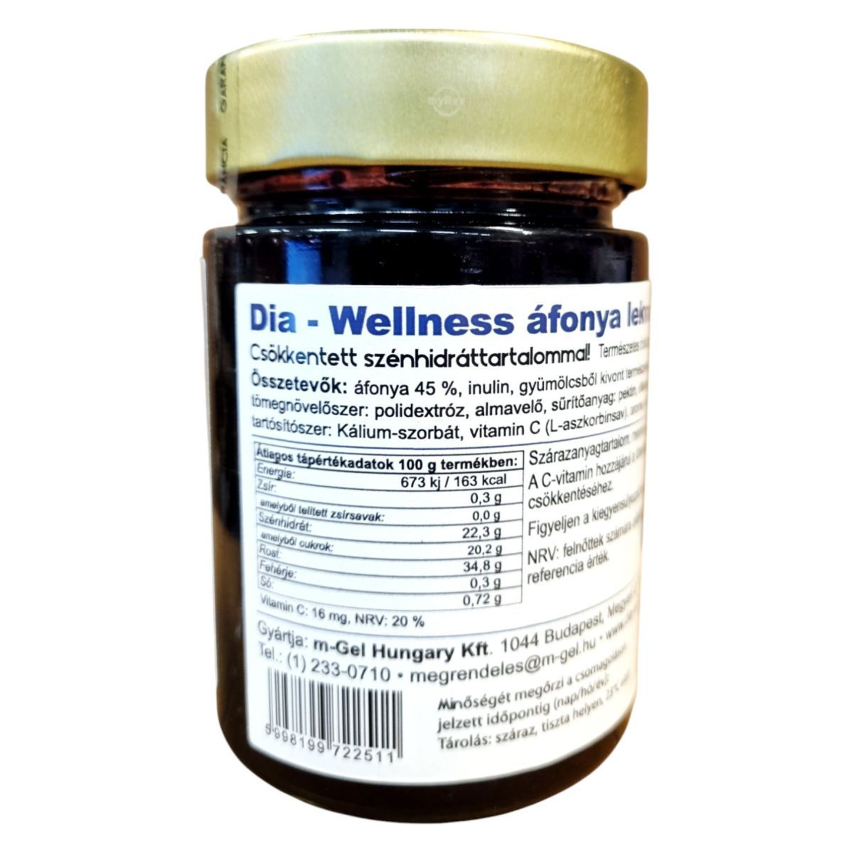 A Dia-Wellness áfonya lekvár egy különleges termék, amely csökkentett szénhidráttartalommal és természetes fruktózzal készül. Az áfonya 45%-os tartalma mellett inulint és polidextrózt is tartalmaz, amelyek hozzájárulhatnak a termék rosttartalmához. A lekvár nem tartalmaz hozzáadott répacukrot, így ideális lehet azok számára, akik low-carb étrendet követnek. A termék C-vitamin tartalma támogathatja a fáradtság csökkentését, de fontos a kiegyensúlyozott táplálkozás fenntartása. A lekvár minimum 60% szárazanyagtartalommal rendelkezik, és a m-Gel Hungary Kft. gyártja Budapesten.