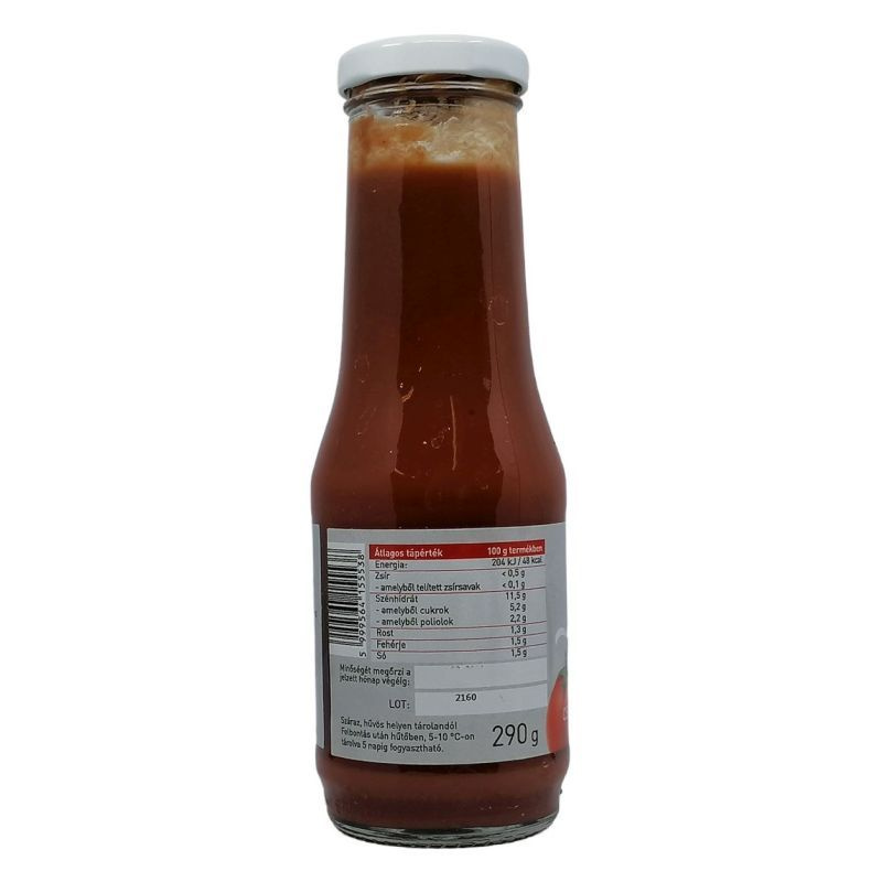 Összetevők: ivóvíz, paradicsomsűrítmény, tápiókakeményítő, édesítőszer (eritrit, szteviol glikozidok), étkezési só, ételecet, étkezési sav: citromsav, vöröshagyma.