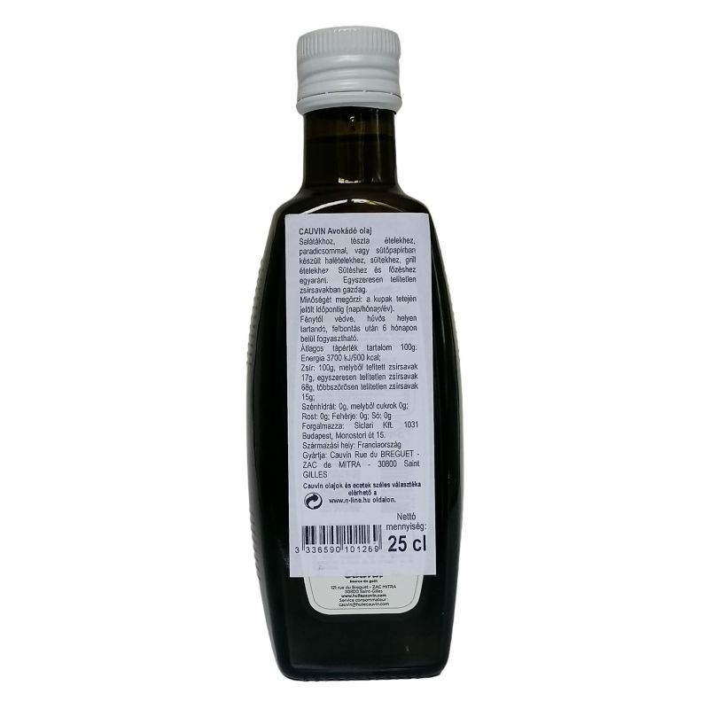 Termék összetétele: avokádó olaj 100%. Tápérték 100 ml termékben: Energia: 3700 kJ/900 kcal, zsírok: 100 g- amelyből telített zsírsavak: 15 g- egyszeresen telítetlen zsírsavak: 70 g- többszörösen telítetlen zsírsavak: 15 g, szénhidrát: 0 g- amelyből cukor: 0 g, rost: 0 g, fehérje: 0 g, só: 0 g.